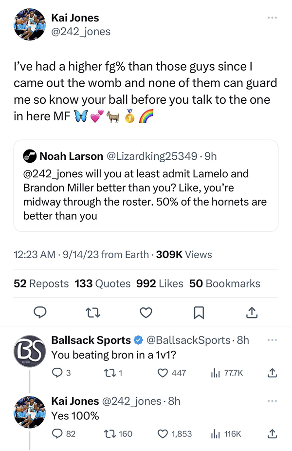 球迷:你至少认可三球和米勒比你强吧?你在球队也只是中游水平,黄蜂有一般的球员比你强。