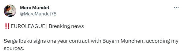 来源:24直播网09-14 09:4924直播网09月14日,杜兰特前队友离开NBA,据欧洲记者Marc Mundet报道,自由球员塞尔吉-伊巴卡与德国篮球俱乐部拜仁慕尼黑签订1年合同,新赛季伊巴卡将转战欧洲联赛。