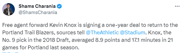 在上赛季交易截止日前,诺克斯先是被活塞交易到勇士,紧接着他就被勇士交易到开拓者;此前开拓者没有执行诺克斯的球队选项,不过现在他们达成新的1年合同,新赛季诺克斯将继续为开拓者效力。