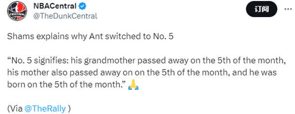 据名记shams报道,爱德华兹本赛季正在为更大的目标而战,5号的意思是他的祖母在5号去世,他的妈妈也在5号去世,而他是5号出生的。