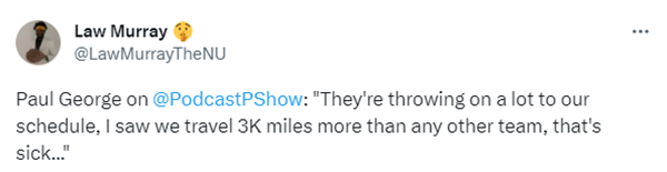 对于这样的赛程,乔治公开吐槽道:他们给我们的赛程中增添了许多负荷,我看着我们要比别的队伍飞至少多3000英里,这太恶心了...