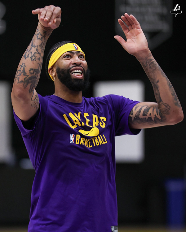 浓眉身穿湖人训练服、戴着黄色发带来到湖人训练馆进行训练,整个人的心情很好,咧嘴大笑十分开心。