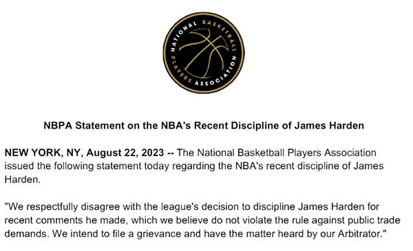 对于哈登被联盟重罚10万美元事件,NBA球员工会表示抗议并且他们将向联盟仲裁委员会提起申诉,NBA球员工会公开声明:我们尊重但不同意联盟因哈登最近的言论而处罚他的决定,我们认为这并不违反联盟禁止公开讨论交易的规则,我们打算提出申诉,并让仲裁委员会审理此事。
