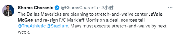 据名记shams报道,独行侠计划用延伸条款裁掉中锋麦基,并重新签下自由球员大莫里斯;独行侠用延伸条款裁员必须在下周之前完成。