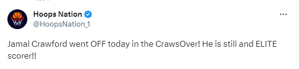 在今天的the Crawsover季后赛揭幕战,43岁的克劳福德多次助攻队友吃饼暴扣,进攻端,克劳福德突破拉杆上篮2+1、背打后仰跳投以及不讲理干拔得分,运球仍旧行云流水,年满43岁,克六仍旧展现不俗的进攻天赋;美媒直呼:他仍旧是一名精英得分手。
