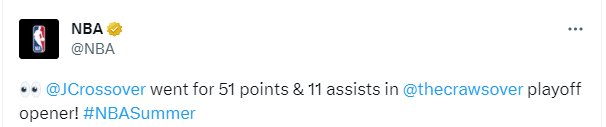 NBA官方转发克劳福德狂砍51分11助攻的集锦视频。