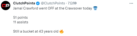 狂轰51分11助!43岁克劳福德续写传奇 NBA官方转发美媒盛赞仍是精英