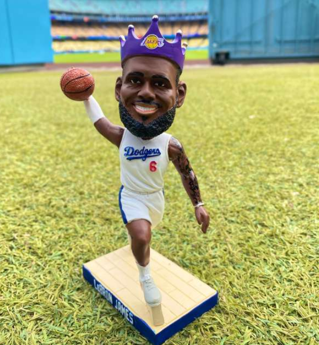 在场的所有球迷都可以获得一个詹姆斯的摇头娃娃——詹姆斯身穿道奇队6号球衣,戴着印有湖人logo的王冠。
