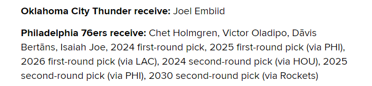 具体的交易方案是雷霆交易霍姆格伦、奥拉迪波、贝尔坦斯、以赛亚-乔、2024首轮选秀权(来自火箭)、2025首轮选秀权(来自费城)、2026首轮选秀权(来自快船)、2024年、2025年和2030年次轮签,从76人得到恩比德。