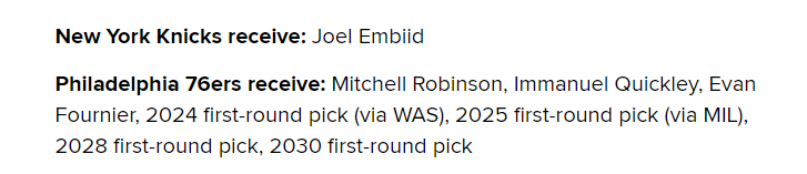 具体的交易方案——尼克斯把米切尔-罗宾逊、奎克利、富尼耶、2024首轮选秀权(来自奇才)、2025首轮选秀权(来自雄鹿)、2028首轮选秀权和2030首轮选秀权送到76人,从而得到恩比德。