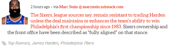 哈登离队陷困境:76人管理层集体拒绝交易 双方闹掰对峙愈演愈烈
