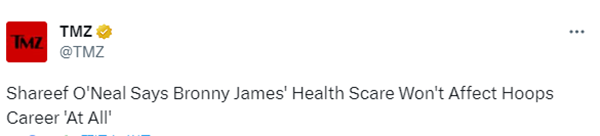 据TMZ报道,谢里夫-奥尼尔刚刚透露了一个好消息,他告诉TMZ,布朗尼在遭遇心脏骤停的健康恐慌后表现良好,所有迹象似乎都表明这“根本不会影响他的篮球生涯”。