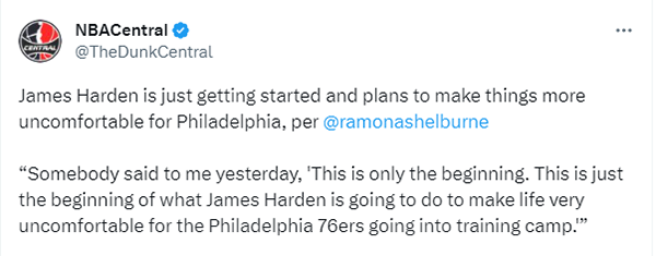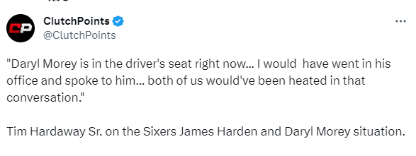 对于哈登的情况,NBA名宿蒂姆-哈达威建议哈登应该到莫雷的办公室,和他进行激烈的交谈;哈达威还表示:76人现在掌握着主动权了,他们不需要交易你了,如果你不来训练营,他们就罚你款,你每不打一场比赛,他们都可以罚你款。