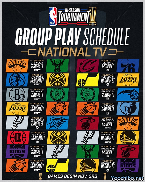 湖人官方公布锦标赛具体赛程——11月11日上午11点,湖人客场对阵太阳;11月15日上午11点30分,湖人主场对阵灰熊;11月18日上午11点,湖人客场对阵开拓者和11月22日上午11点,湖人主场对阵爵士;其中湖人对阵太阳和对阵爵士这两场比赛是全美直播,小组赛总共有16场全美直播。