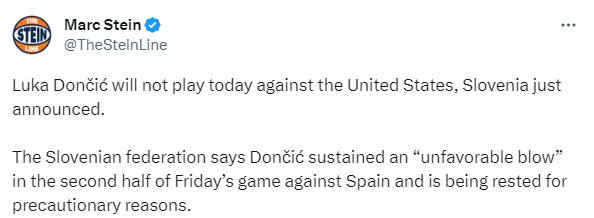 多位名记报道东契奇不会参加与美国男篮的热身赛,斯洛文尼亚篮协表示东契奇在上一场与西班牙的热身赛下半场遭遇不利的打击,处于预防而选择缺席比赛。