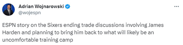 据报道,76人已经结束了对10届全明星哈登的交易谈判,计划将他带回训练营,他们将以不舒服的局面开始新赛季;在休赛期,76人与哈登想去的快船队进行了间歇性的谈判,但双方没有达成交易;在哈登执行球员选项并且申请离队后,76人与其他球队进行了谈判,但76人对哈登的要价太高,包括快船在内的任何球队都不愿意或能够满足。