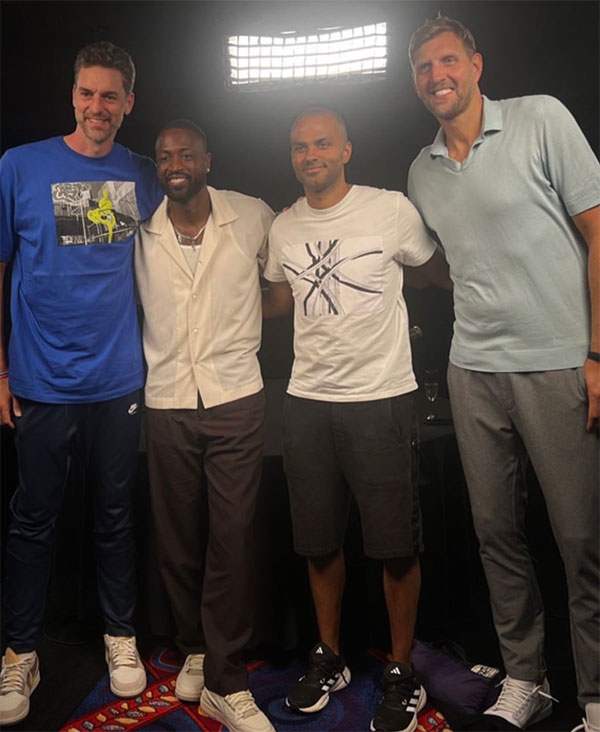 帕克还晒出他与韦德、保罗-加索尔以及诺维斯基的合影,他们四人都将在周日正式入选名人堂,NBA四大传奇难得同框出镜,他们累计拿到10个总冠军。