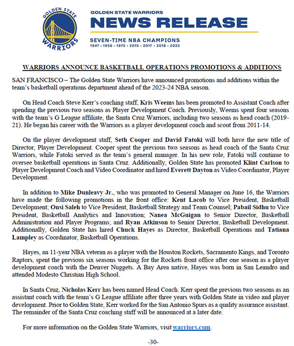勇士人事变动——克里斯-威姆斯被提拔为助理教练,加入科尔的教练组;赛思-库珀(原圣克鲁兹勇士队主教练)和大卫-法托基成为球员发展总监;Ryan Atkinson晋升为篮球发展高级总监;Klint Carlson担任球员发展教练兼视频协调员,勇士正式聘请查克-海耶斯担任篮球运营总监,勇士老板拉科布之子Kent Lacob晋升为篮球发展副总裁,成为勇士新总经理邓利维的得力助手,科尔之子尼克-科尔正式担任圣克鲁兹勇士队主教练。
