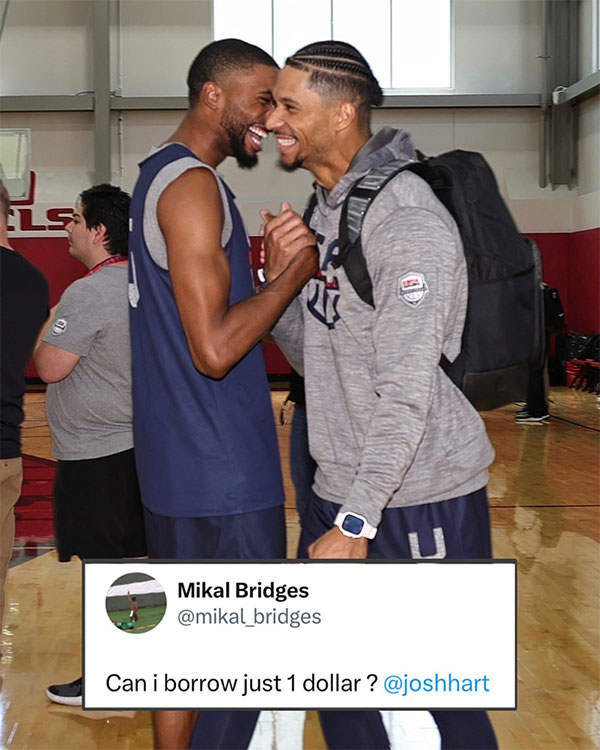 看到哈特即将续签4年8100万美元,布里奇斯发推写道:我能向你借一美元吗?