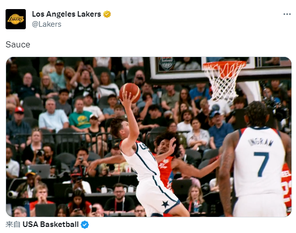 里夫斯冲上推特热搜引热议,詹姆斯发推盛赞里夫斯:A-R,你太冷酷了#Team USA;湖人官方转发里夫斯精彩上篮,也夸赞他。