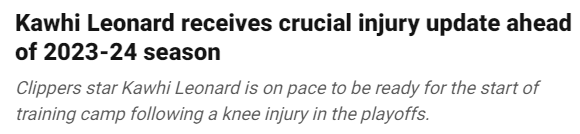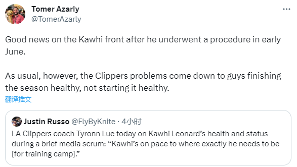对于小卡的情况,名记Tomer Azarly表示,6月初手术,对于小卡来说这是一个好消息,不过,快船队的问题归根结底在于球员们在赛季结束时保持健康,而不是在赛季开始时保持健康。