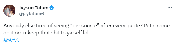 对于记者的爆料,凯尔特人球星塔图姆十分不满,发推写道:还有谁也厌倦了‘根据消息人士透露’这种句式吗?把名字写上去!不然就把这些话憋在你心里!
