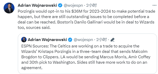 奇才送走波尔津吉斯,得到马库斯-莫里斯、阿米尔-科菲和今年首轮30号(来自快船)以及加里纳利(来自凯尔特人);凯尔特人得到波尔津吉斯,快船得到布罗格登。
