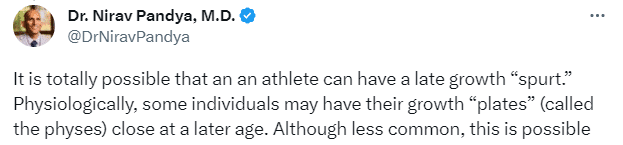 难道库明加真的长高了吗?医学专家Nirav Pandya表示,运动员完全有可能出现后期生长“突增”。从生理学角度来看,有些人可能在晚些时候会出现生长“板”闭合,虽然不太常见,但这是可能的。