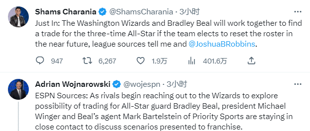 名记Shams报道,奇才开始商讨为全明星比尔寻找下家,如果奇才队准备在不久后的未来重建,球队将会和比尔合作为比尔寻求交易,比尔希望去到的是一支争冠球队。
