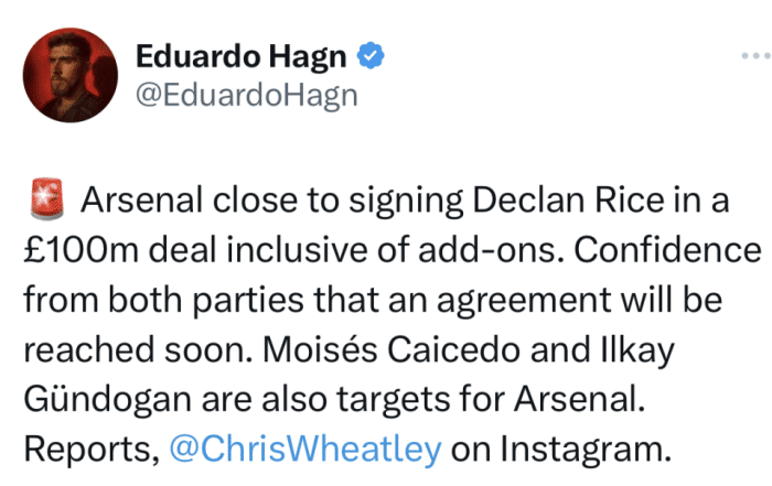 现年24岁的赖斯,司职后腰。本赛季,赖斯为西汉姆联出场50次贡献了5球4助,他以队长的身份率队夺得欧协联冠军。目前在德国《转会市场》上,赖斯身价高达8000万欧元。除了阿森纳之外,拜仁、切尔西、纽卡和曼联也对赖斯有意,但枪手行动最积极。
