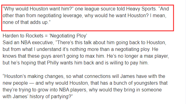 美媒​Heavy Sports报道,消息人士表示,为什么休斯顿会想要哈登?除了谈判筹码,他为什么要重返火箭?我的意思是,这些都不成立。