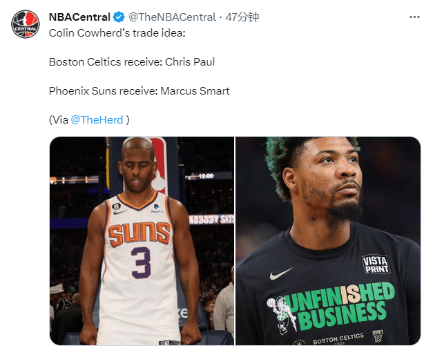 名嘴Colin Cowherd建议太阳和凯尔特人进行交易,交易方案是保罗和斯玛特互换球队。