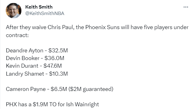 据名记Keith Smith报道,在裁掉保罗后,太阳目前仅剩5名拥有保障合同的球员,具体情况——杜兰特下赛季工资4760万美元、布克3600万美元、艾顿3250万、沙梅特1030万美元、佩恩650万美元(200万美元受保障)