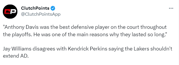 前NBA球员杰伊-威廉姆斯也力挺湖人续约浓眉:在整个季后赛中,安东尼-戴维斯都是场上最好的防守球员,他才是湖人能在季后赛坚持这么久最主要的原因之一。