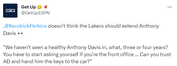前NBA球员帕金斯也表示不该续约浓眉,表示:我认为湖人不应该续约安东尼-戴维斯,3年或4年了,都没有看到一个健康的戴维斯,如果你是球队的总经理,你敢信任他,把一切都压在他身上吗?