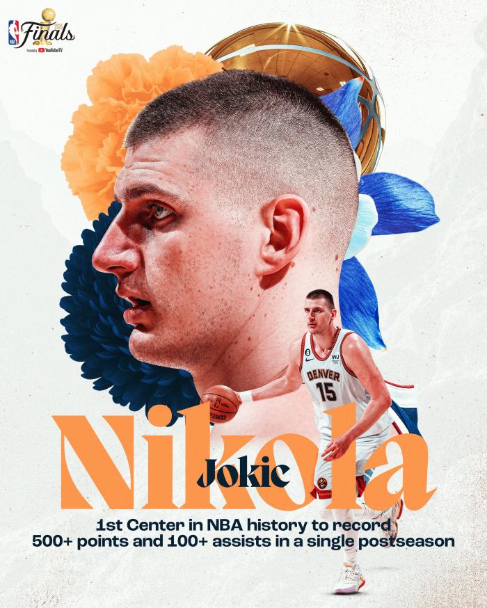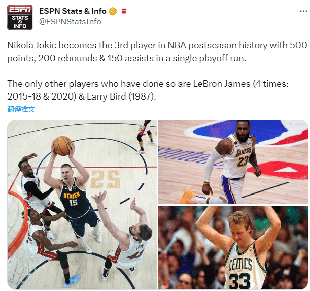 2、约基奇成为史上第三位单个季后赛至少拿到500分200篮板150助攻的球员,比肩詹姆斯(4次)和拉里-伯德成为历史第三人