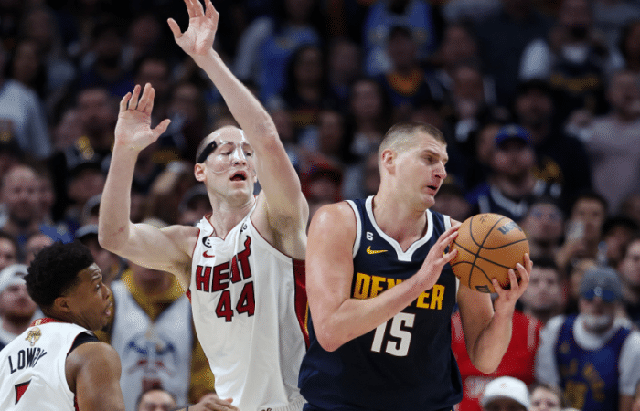 下半场,热火第三节11-7追到2分,期间约基奇抛投以及命中正面三分,两队开始僵持拉锯,约基奇扛起掘金进攻大旗,三分造阿德巴约犯规并且三罚全中,多次持球杀到禁区得分、背打勾手以及全场一条龙碾压上篮,人类五花肉精华真发狠了,单节9投6中独砍18分打爆泽勒,带队一直保持领先,约基奇罚球时全场高呼MVP。
