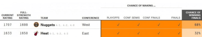 根据最新预测,掘金夺冠概率高达68%,热火夺冠概率仅32%,热火一路黑到总决赛,他们仍旧是不被看好的一方。