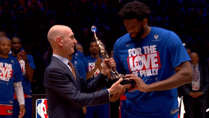 在76人和凯尔特人G3赛前,恩比德正式捧起属于他迈克尔-乔丹奖,NBA总裁亚当-萧华来到费城,亲自为他颁奖;现场球迷集体为他高呼MVP。