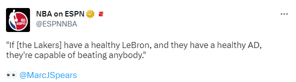 名记Marc Spears表示,如果湖人队詹姆斯和浓眉都能保持健康,他们可以击败任何人。