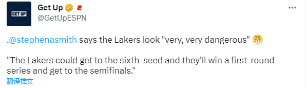 对于现在的湖人队,名嘴A-史密斯在节目中表示湖人看起来非常非常危险,湖人会成为6号种子,他们将赢得季后赛首轮并进入半决赛。