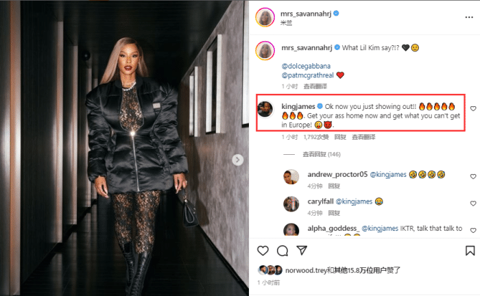 24直播网讯02月26日,近日詹嫂萨瓦娜参加米兰时装周,身穿蕾丝透视打底出镜,性感亮相并且拍摄大片,38岁詹姆斯在老婆评论区留言写道:赶紧给我回家,家里有你在欧洲得不到的东西。