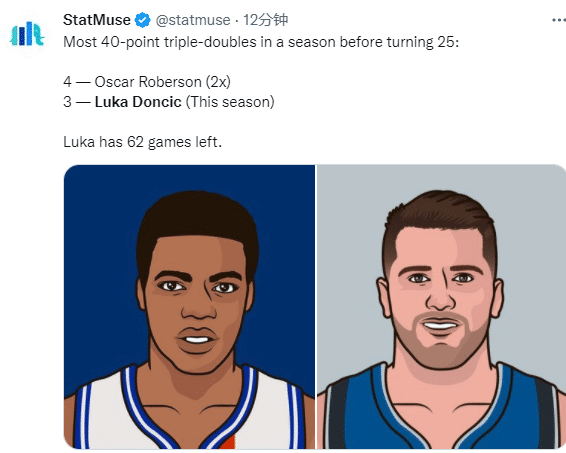 10、东契奇(23岁)本赛季第3次砍下40+三双,为联盟历史上25岁以下球员中单赛季第二多,仅次于奥斯卡-罗伯特森(2次达成过单赛季4次40+三双)