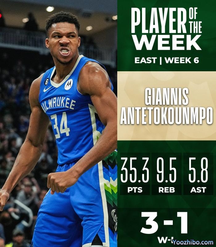 上周字母哥带领雄鹿拿到3胜1负的战绩,场均拿到35.3分9.5篮板5.8助攻,对阵开拓者轰下37分7篮板6助攻,对阵公牛砍下36分11篮板7助攻,对阵骑士轰下38分9篮板6助攻和对阵独行侠拿到30分11篮板4助攻。