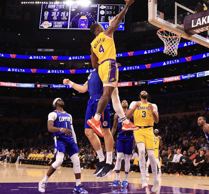 下半场,湖人和快船第三节僵持对战,期间浓眉重摔倒地太惊险,所幸身体无碍可湖人全队突然不得分,被快船打出17-0的攻击波,湖人瞬间落后到两位数;安德森轰进三分为湖人打破僵局,湖人再次追分,詹姆斯造犯规两罚全中,钉板大帽鲍威尔,老詹一条龙暴扣,湖人美女老板珍妮-巴斯开心庆祝,三节打完湖人落后8分。
