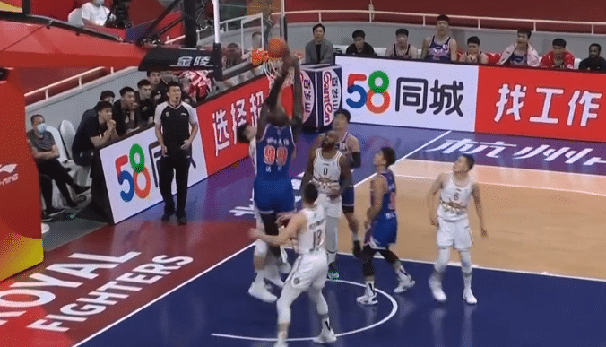 紧接着北控的进攻,新疆男篮防守很凶,北控疑似8秒违例,但裁判没有表示。高登空切上篮,被在篮下的法尔直接钉板大帽。