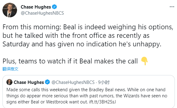 24直播网讯 北京时间7月27日,究竟比尔是否会申请离队?奇才记者Chase Hughes表示球队已经和比尔沟通过,比尔没有表达不满,并且球队没有看到比尔要离队的迹象。