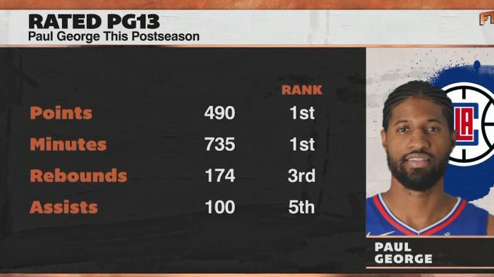 乔治季后赛总共490分联盟第一、总共上场735分钟联盟第一、抢到174个篮板联盟第三以及100次助攻联盟第五;小卡受伤之后,乔治扛起快船的攻防大旗,借用卢指导的一句话——没有乔治,快船是走不到西决的位置的。