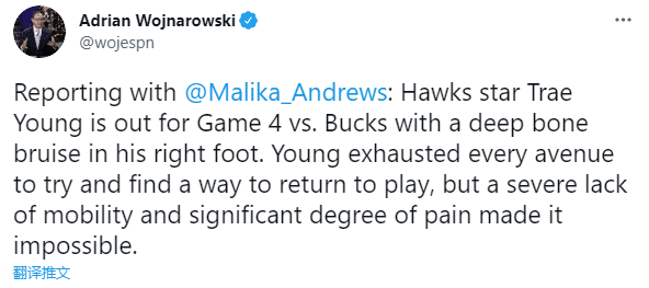 东决G3第三节,特雷-杨踩到边线裁判的脚导致脚踝扭伤,末节带伤出战却突然没了状态,最终老鹰惨遭逆转;核磁共振检查结果显示,杨的右脚有一处骨头挫伤;虽然G4赛前参加了部分训练,无奈遭遇脚伤的困扰,严重影响运动以及伤势太痛疼,他因伤缺席东决第四场。