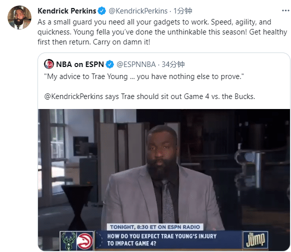 杨因伤缺席东决G4,名嘴帕金斯建议特雷-杨该休战,直言杨已经无需证明什么,年轻人已经打出一个不可思议的赛季,等到健康再重返赛场。